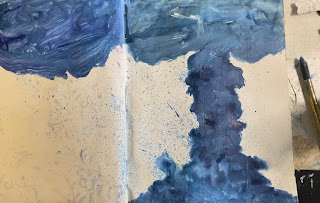 With the layer of gesso dry I then spritzed the page with the distress water sprayer and then added some drops of Distress paint. I used salty ocean, broken china, mermaid lagoon, blueprint sketch, and speckled egg. Here I am starting to make the skyline.Then I spritzed the paint again and let the paint flow and start to marble.